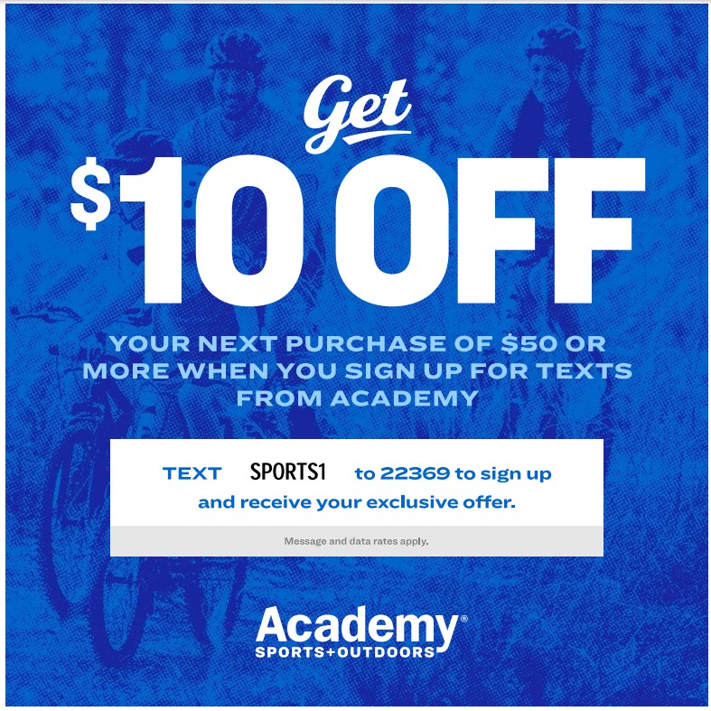 Sign up for texts from Academy Sports + Outdoors and save $10.