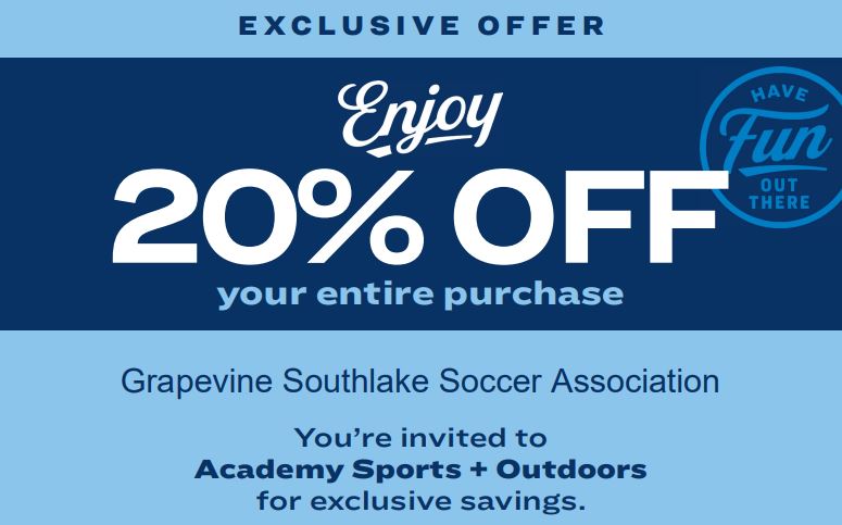 GSSA players and families can join us for discounts at Academy Sports + Outdoors valid 8/15/2025 through 8/17/2025.